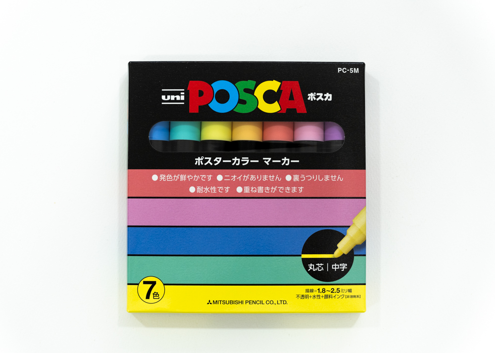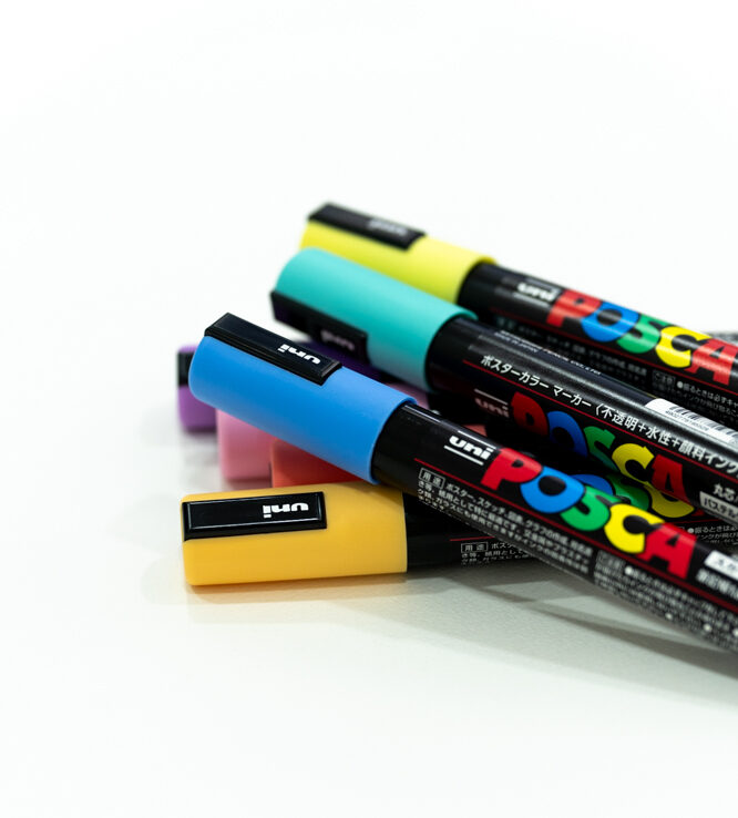 Los marcadores de pintura acrílica Posca están hechos a base de agua, con tinta fluida y rica en pigmento. Ideales para usar en casi todas las superficies: papel, cartón, madera, vidrio, plástico, metal, arcilla, cemento, tela, lienzo, superficies brillantes como fotografías, y más. Los trazos y escrituras tienen un acabado mate (opaco) en superficies porosas y no porosas. La tinta se puede raspar de superficies ‘no porosas’, como vidrio y acrílico; y es permanente en superficies ‘porosas’ como papel y madera.